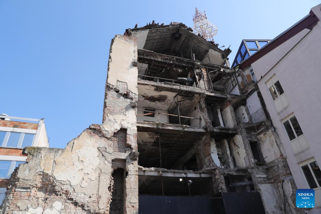 The bombed Radio Television Serbia (RTS) building is seen in Belgrade, Serbia, March 21, 2022. In Belgrade, there are many scars left by the NATO bombings. The NATO bombings of Yugoslavia started on March 24, 1999. During the 78-day military attack, 2,500 civilians were killed, and around 25,000 objects were damaged, including airports, hospitals, schools, cultural monuments and road infrastructure, according to the Serbian government. (Xinhua/Zheng Huansong)