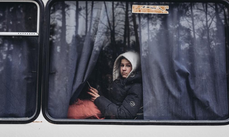 A woman sits on a bus in Irpin, Ukraine, March 5, 2022. Photo: Xinhua