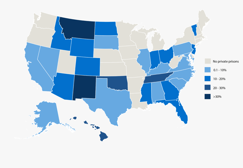 Proportion of incarcerated population in private prisons, 2019. (https://www.sentencingproject.org/)