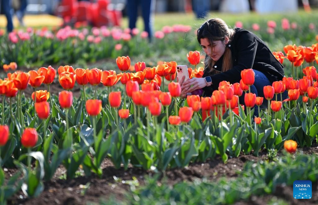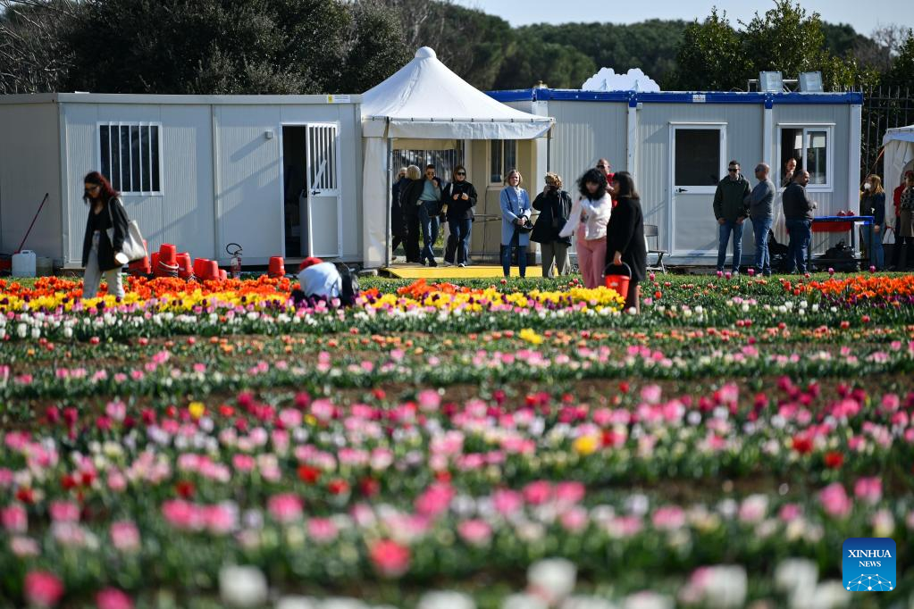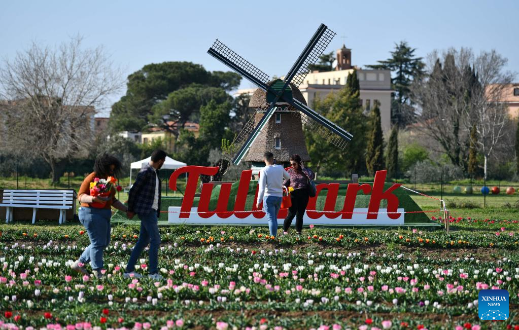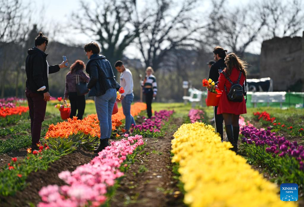 People enjoy themselves at the TuliPark in Rome, Italy, on March 22, 2022. The tulip garden with more than one hundred varieties opened to the public here on Tuesday. (Xinhua/Jin Mamengni)