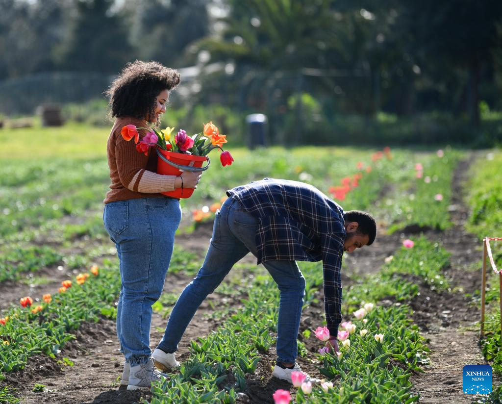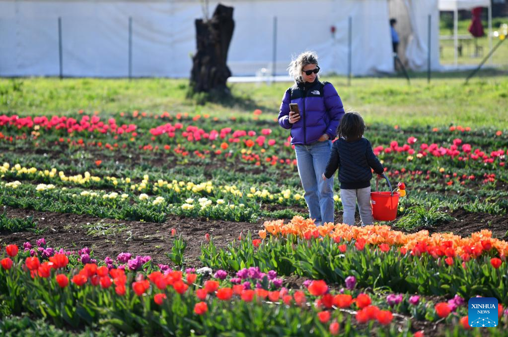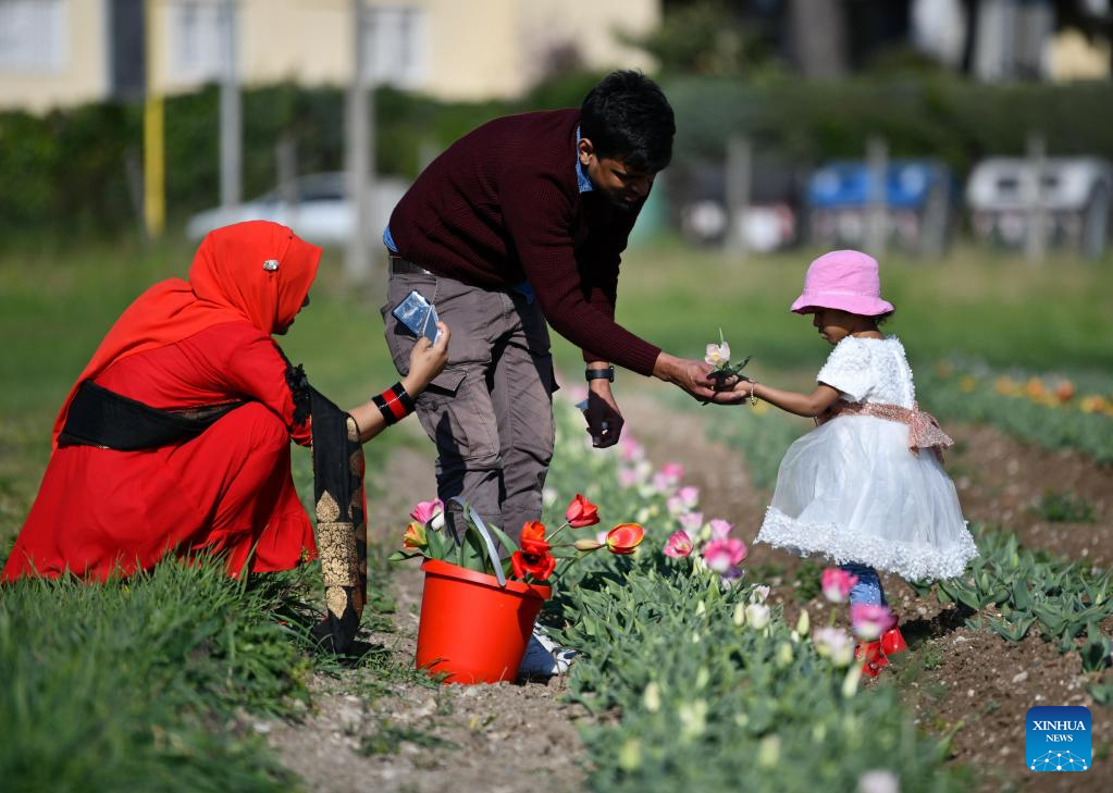A man picks tulips at the TuliPark in Rome, Italy, on March 22, 2022. The tulip garden with more than one hundred varieties opened to the public here on Tuesday. (Xinhua/Jin Mamengni)