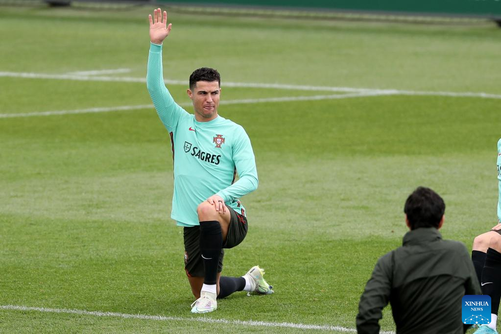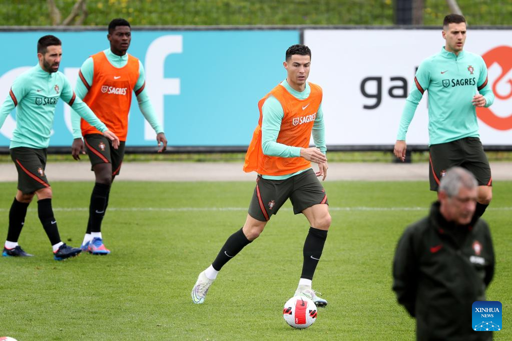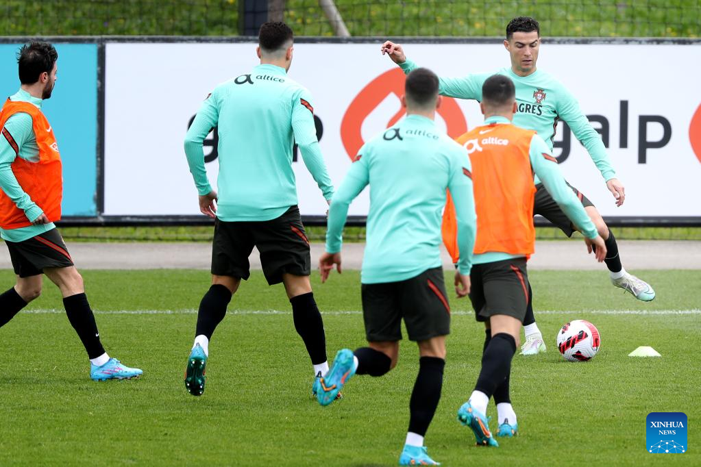 Portugal's forward Cristiano Ronaldo (1st R) attends a training session at Cidade do Futebol training camp in Oeiras, Portugal, on March 22, 2022, ahead of the 2022 World Cup qualifying football match against Turkey. (Photo by Pedro Fiuza/Xinhua)