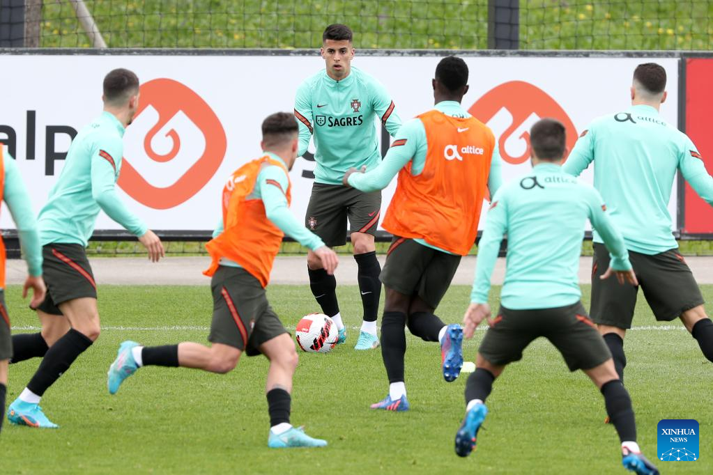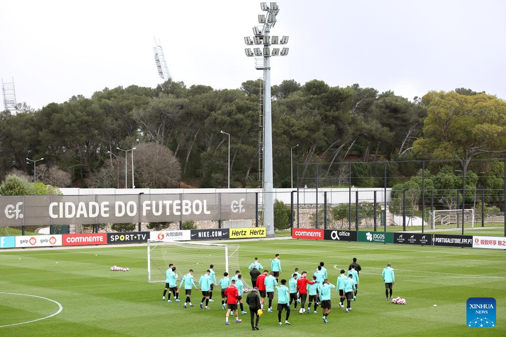 Portugal's football team players attend a training session at Cidade do Futebol training camp in Oeiras, Portugal, on March 22, 2022, ahead of the 2022 World Cup qualifying football match against Turkey. (Photo by Pedro Fiuza/Xinhua)