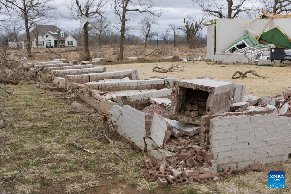 Photo taken on March 22, 2022 shows a school building damaged by a tornado in Jacksboro, northern Texas, the United States. Many people were injured after several tornadoes on Monday ripped through parts of the south-central U.S. states of Texas and Oklahoma, officials said. (Photo by Dan Tian/Xinhua)