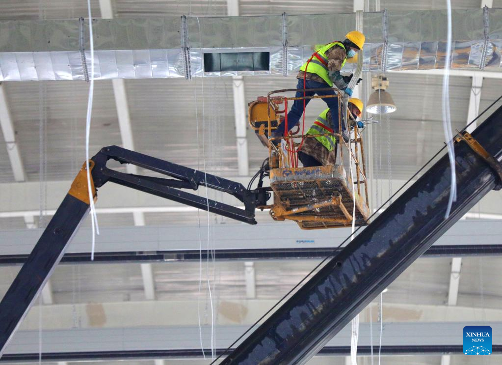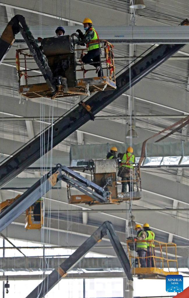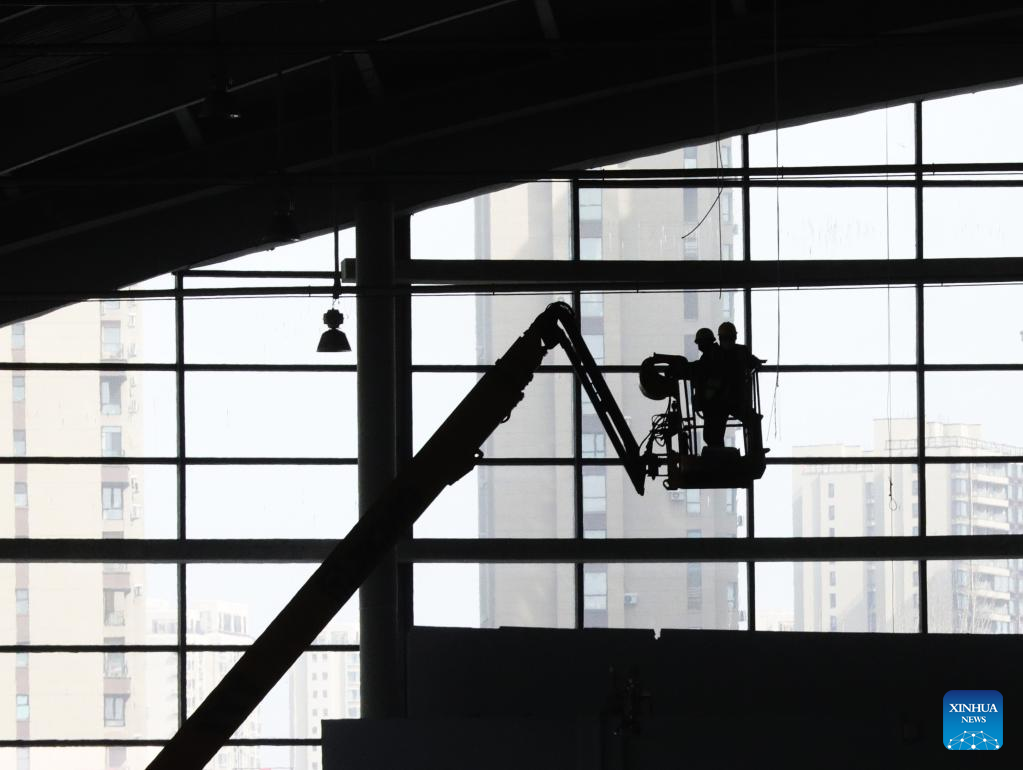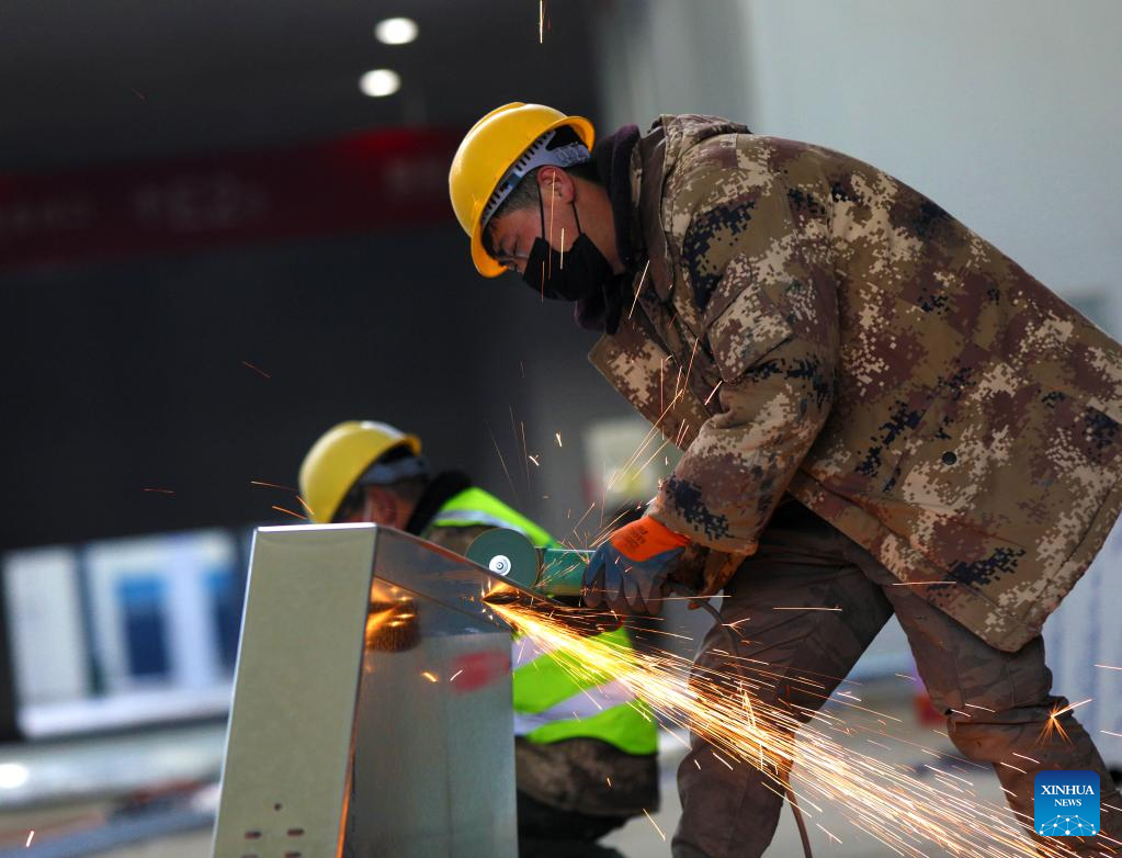 Staff members work at the construction site of the temporary hospital at Shenyang International Exhibition Center in Shenyang, northeast China's Liaoning Province, March 22, 2022. The temporary hospital and health station at Shenyang International Exhibition Center started construction on March 20, 2022. (Xinhua/Yang Qing)
