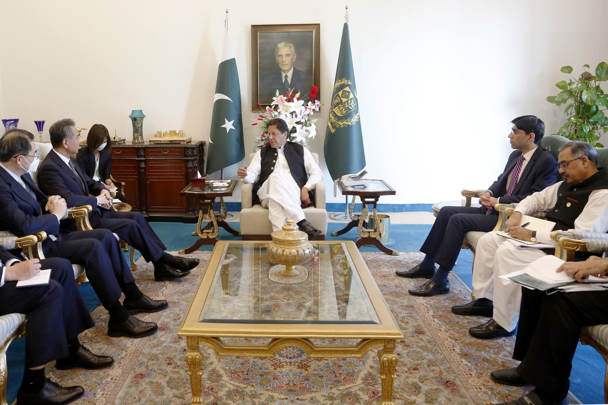 Pakistani Prime Minister Imran Khan (C) meets with Chinese State Councilor and Foreign Minister Wang Yi (2nd L) in Islamabad, Pakistan, March 22, 2022. [Photo/Xinhua]
