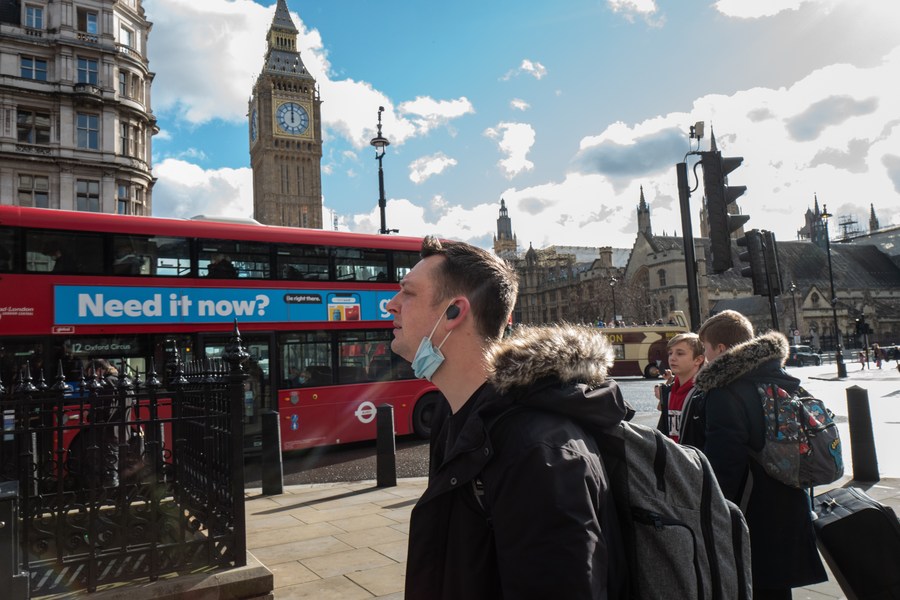 People walk near the Big Ben in London, Britain, Feb. 24, 2022. (Photo by Andy Hall/Xinhua)