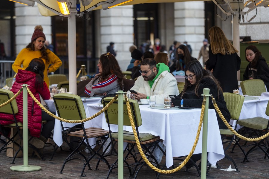 People dine outside at Covent Garden in London, Britain, Jan. 19, 2022. (Photo by Stephen Chung/Xinhua)
