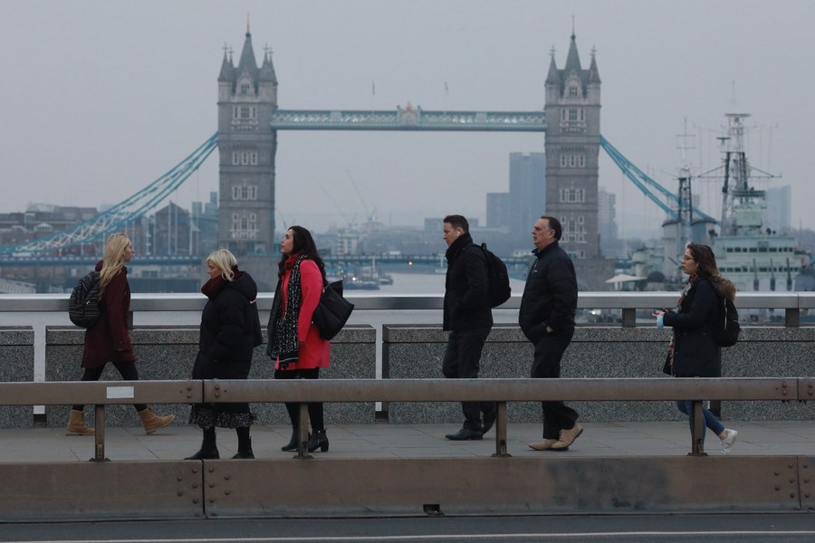 People cross London Bridge during the morning rush hour in London, Britain on Jan. 24, 2022. (Photo by Tim Ireland/Xinhua)