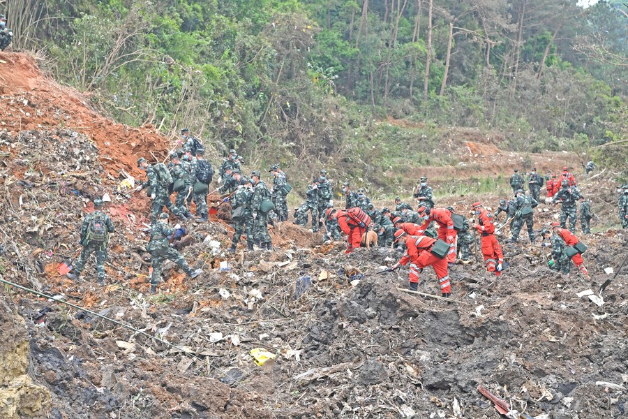 Rescuers search for the black boxes at a plane crash site in Tengxian County, south China's Guangxi Zhuang Autonomous Region, March 22, 2022. (Xinhua/Zhou Hua)