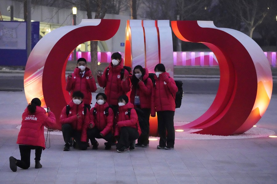 Members of the Japanese delegation take for photos at the Olympic Village for the Beijing 2022 Olympic Winter Games, Jan. 30, 2022. (Mark Schiefelbein/AP/Pool via Xinhua)