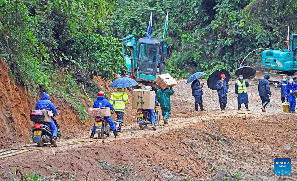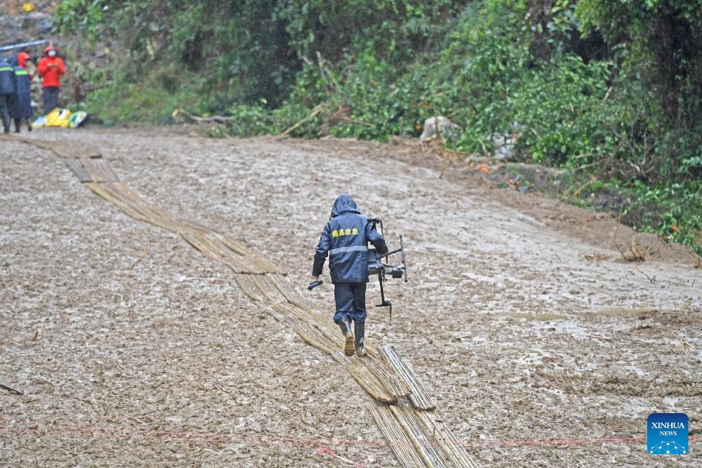 A road leading to the core site of the accident has been built and weaved bamboo has been laid along the road to reduce the impact of the rain. (Xinhua/Zhou Hua)