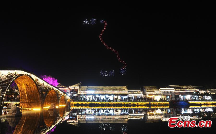 Drones perform in the night sky over Hangzhou, East China's Zhejiang Province, March 23, 2022. A spectacular drone show was held Wednesday to mark the 200-day countdown to the 4th Asian Para Games Hangzhou 2022, which is scheduled to open in Hangzhou on October 9. (Photo: China News Service/Wang Gang)