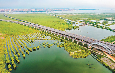 Photo shows the Haoji Railway line and Hangrui Expressway running through the reed marshes of the East Dongting Lake National Nature Reserve in Yueyang city, central China's Hunan Province, a nature reserve located in the eastern section of Dongting Lake that was included among the first batch of national-level wetlands in China of international importance. (Photo/Zhao Min)