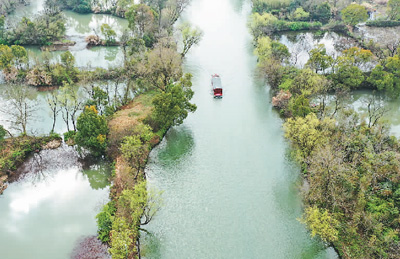 A boat sails on a river within the Xixi National Wetland Park in Hangzhou, capital of east China's Zhejiang Province in the early springtime. (Xinhua/Weng Xinyang)
