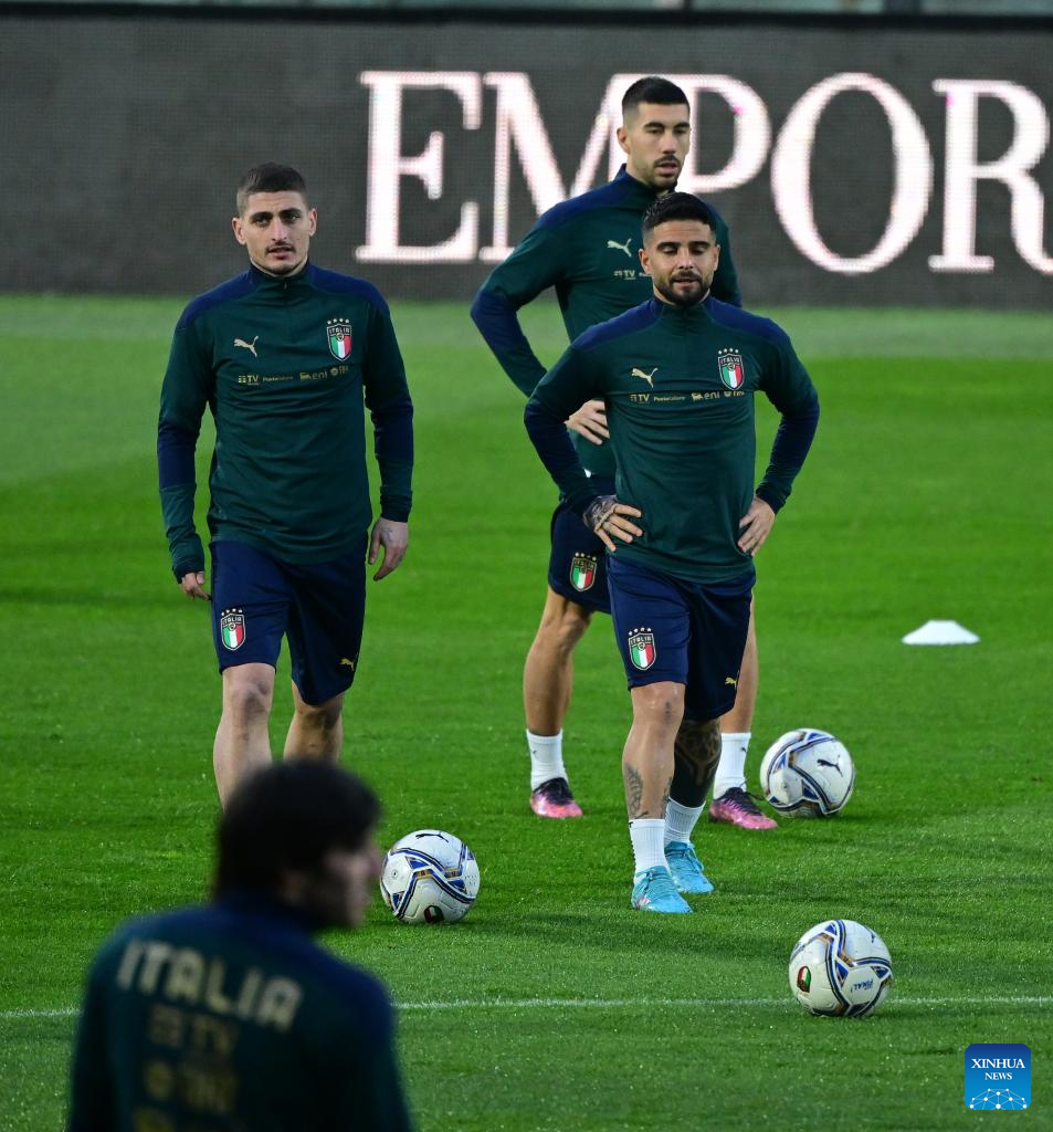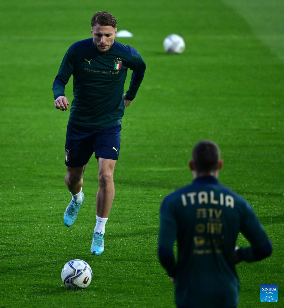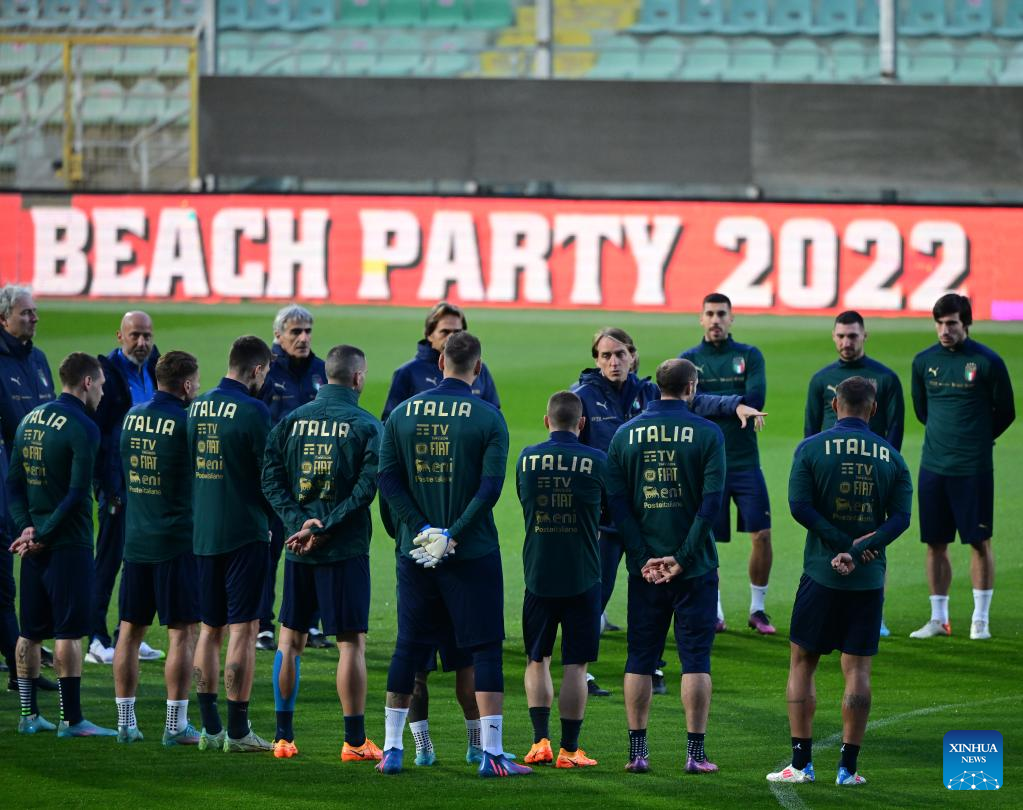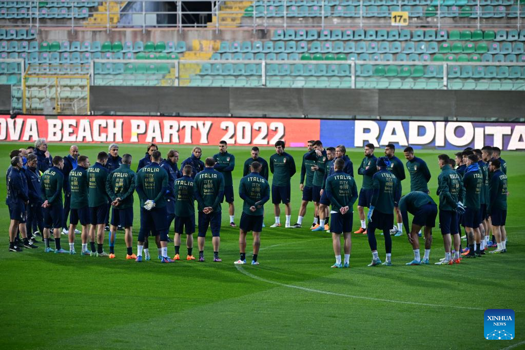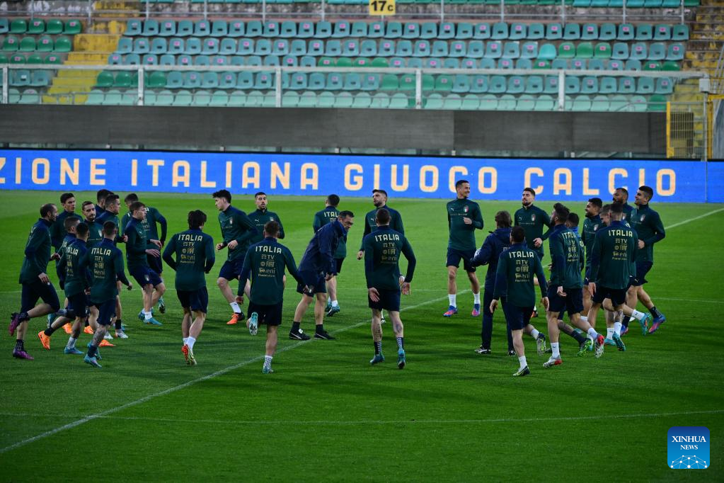 Italy's players attend the training session ahead of the 2022 World Cup qualifying play-off football match between Italy and North Macedonia in Palermo, Italy, on March 23, 2022. (Photo by Alberto Lingria/Xinhua)