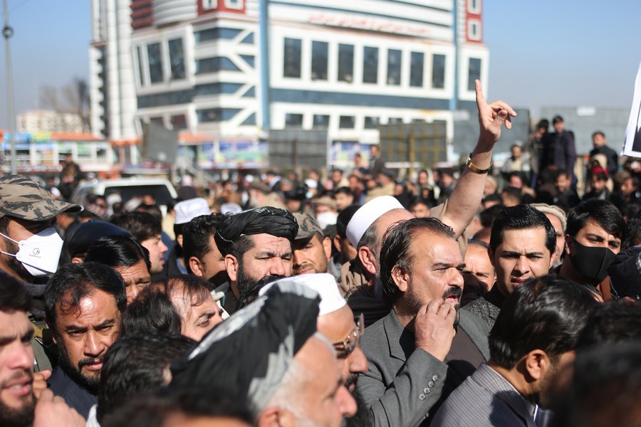 People participate in a protest against the U.S. decision regarding the frozen Afghan assets in Kabul, capital of Afghanistan, Feb. 15, 2022. (Photo by Saifurahan Safi/Xinhua)