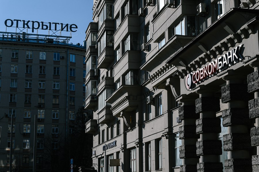 The signs of Bank Otkritie (L) and Sovcombank (R) are seen in Moscow, Russia, Feb. 25, 2022. As the Ukraine crisis is arousing widespread concerns, the United States, the European Union (EU), and Britain have announced sanctions against Russia for its latest actions. (Xinhua/Evgeny Sinitsyn)