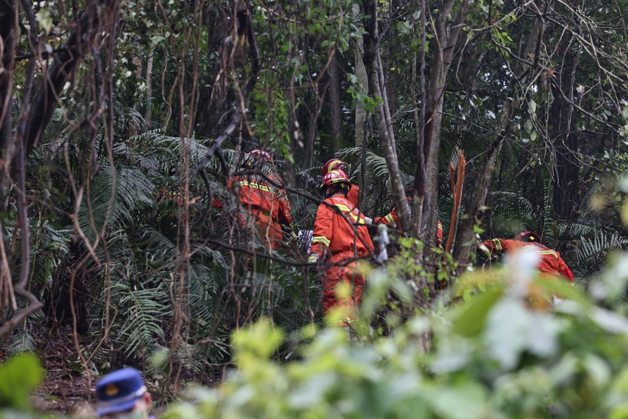 Rescuers conduct search and rescue work at a plane crash site in Tengxian County, south China's Guangxi Zhuang Autonomous Region, March 24, 2022. (Xinhua/Lu Boan)