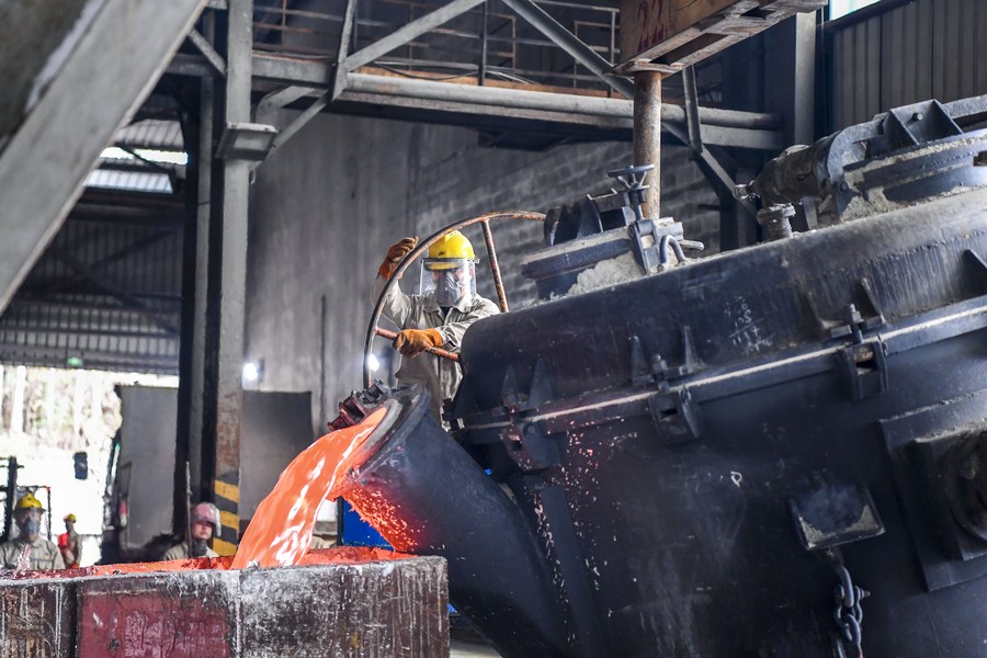 Workers operate equipment to deal with liquid aluminum at an aluminum factory in Baise City, south China's Guangxi Zhuang Autonomous Region, Feb. 18, 2022. (Xinhua/Cao Yiming)