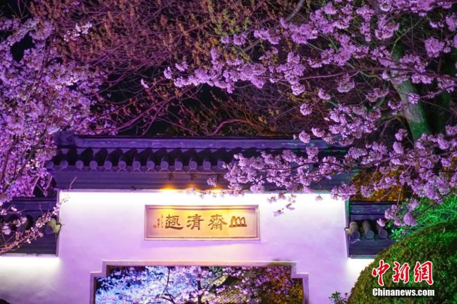 Night scenery of cherry blossoms at the Yuantouzhu (Turtle Head Isle) scenic spot in Wuxi, Jiangsu Province, March 23, 2022. The special beauty of cherry blossoms draws many viewers each year. (Photo: China News Service/Sun Quan)