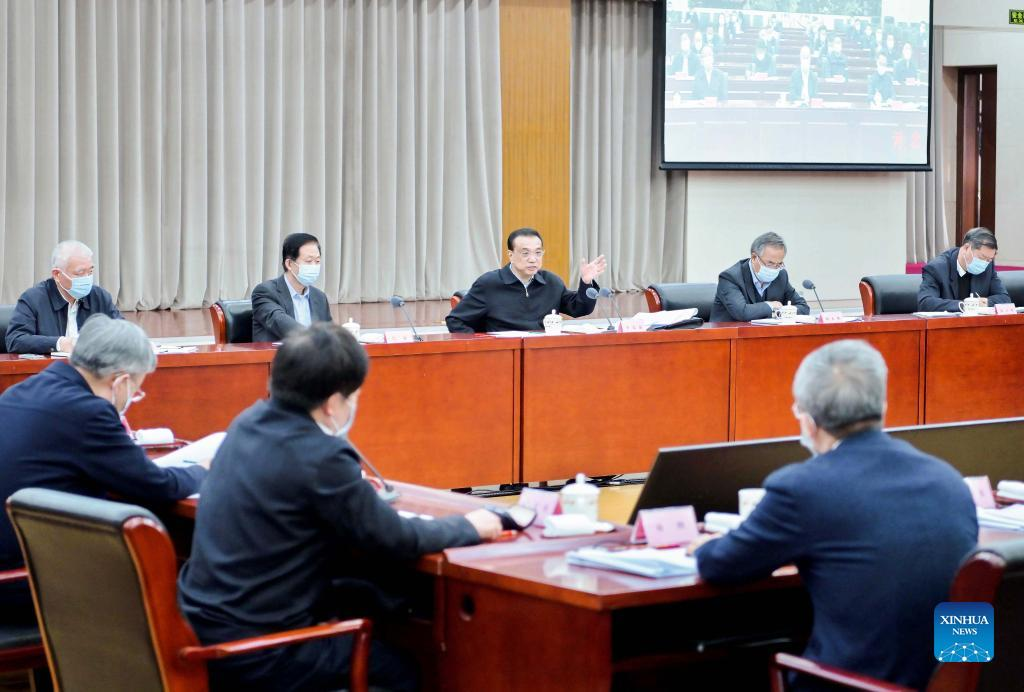 Chinese Premier Li Keqiang, also a member of the Standing Committee of the Political Bureau of the Communist Party of China Central Committee, makes an inspection of the Ministry of Agriculture and Rural Affairs and chairs a symposium, March 23, 2022. (Xinhua/Li Tao)