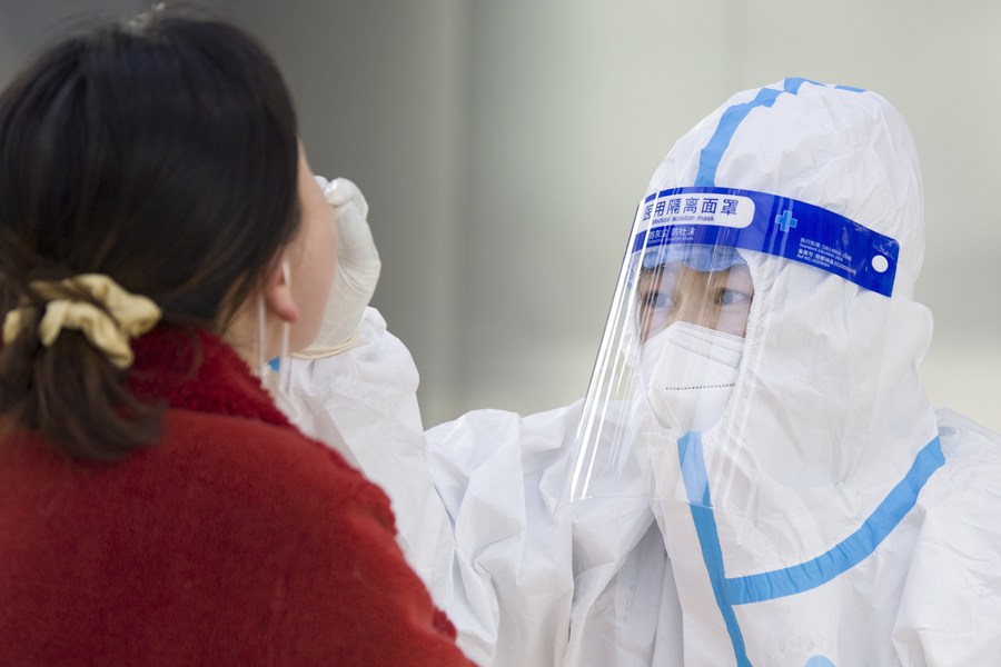 A medical worker takes a swab sample from a resident for nucleic acid test at a COVID-19 testing site in Changchun, northeast China's Jilin Province, March 21, 2022. (Photo by Zhang Yang/Xinhua)