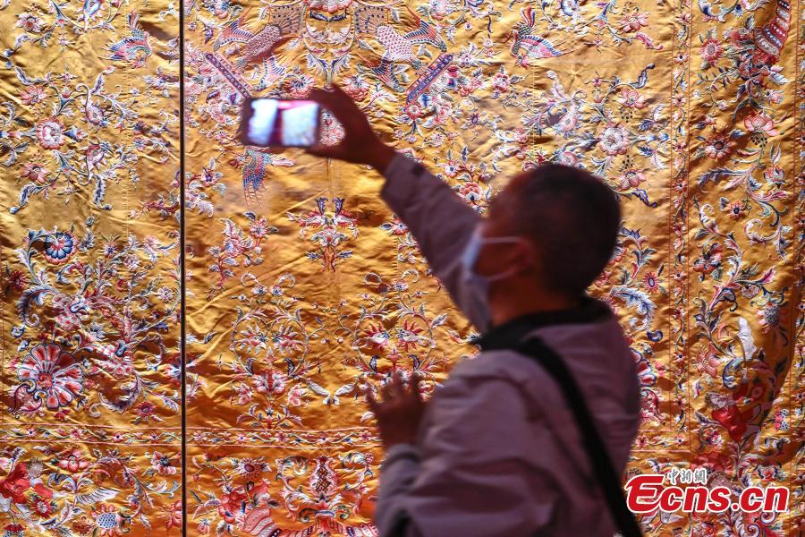 A visitor takes photos of a flower pattern silk bed sheet at Guangdong Museum based in Guangzhou, March 24, 2022. (Photo: China News Service/Chen Jiwen)