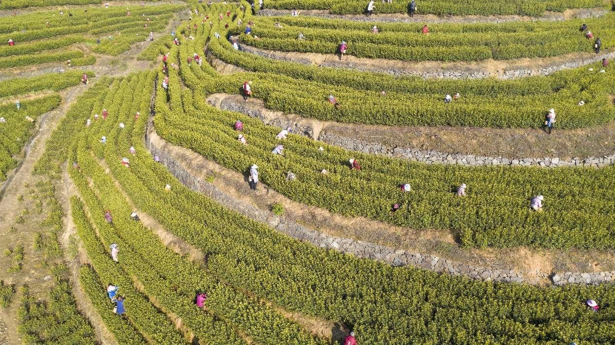 An abandoned coal mine is transformed into a vast tea garden in Donghong village, Daixi township, Huzhou, east China's Zhejiang province. The tea garden is generating annual revenue over 10 billion yuan for villagers. (People's Daily Online/Deng Dehua)