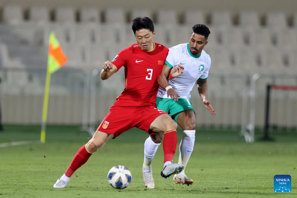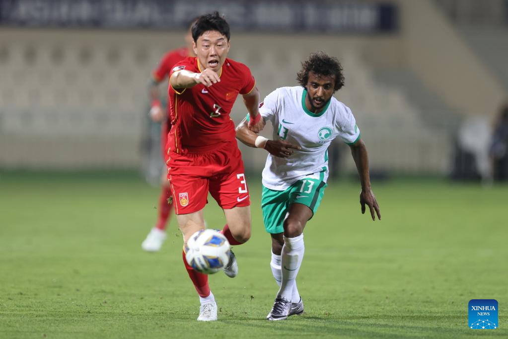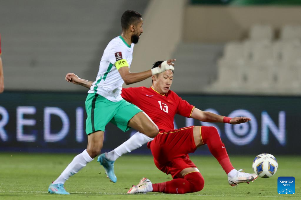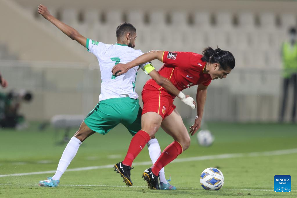 Gao Zhunyi (L) of China competes during the Group B match between China and Saudi Arabia of FIFA World Cup Qatar 2022 Qualifier in Sharjah, the United Arab Emirates, March 24, 2022. (Str/Xinhua)
