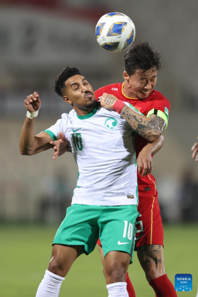 Xu Xin (R) of China competes against Salman Al-Faraj of Saudi Arabia during the Group B match between China and Saudi Arabia of FIFA World Cup Qatar 2022 Qualifier in Sharjah, the United Arab Emirates, March 24, 2022. (Str/Xinhua)