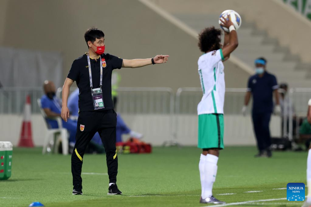 Head coach Li Xiaopeng (L) of China instructs during the Group B match between China and Saudi Arabia of FIFA World Cup Qatar 2022 Qualifier in Sharjah, the United Arab Emirates, March 24, 2022. (Str/Xinhua)