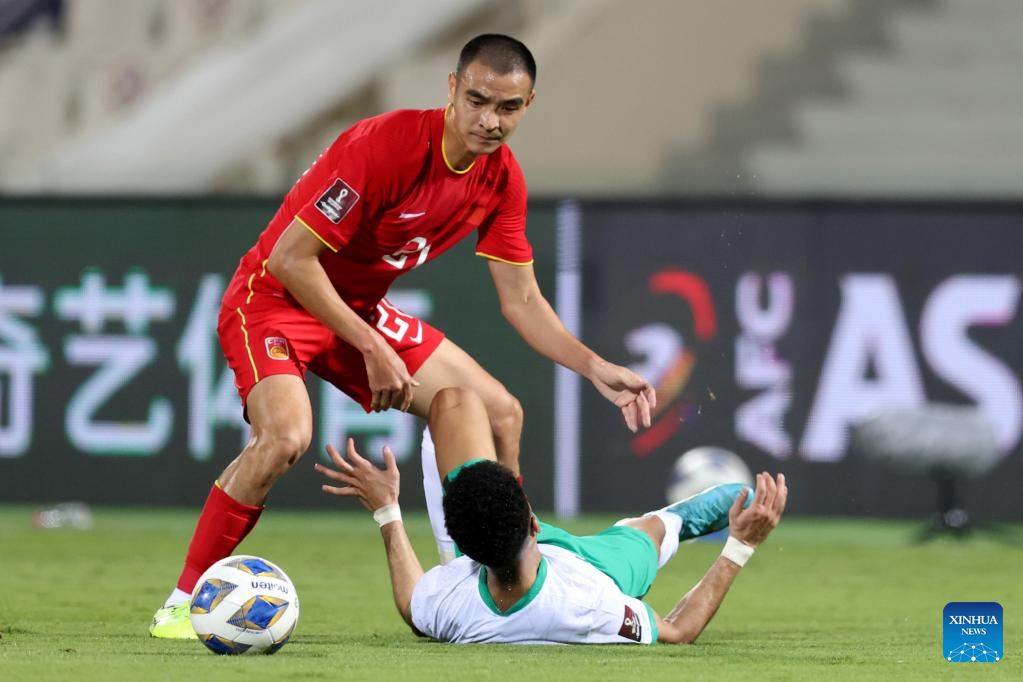 Liu Binbin (L) of China competes during the Group B match between China and Saudi Arabia of FIFA World Cup Qatar 2022 Qualifier in Sharjah, the United Arab Emirates, March 24, 2022. (Str/Xinhua)