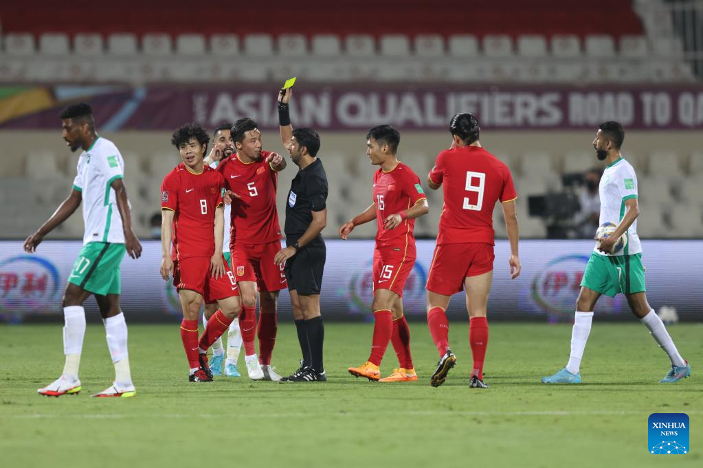 Hao Junmin (2nd L) of China receives a yellow card from the referee during the Group B match between China and Saudi Arabia of FIFA World Cup Qatar 2022 Qualifier in Sharjah, the United Arab Emirates, March 24, 2022. (Str/Xinhua)