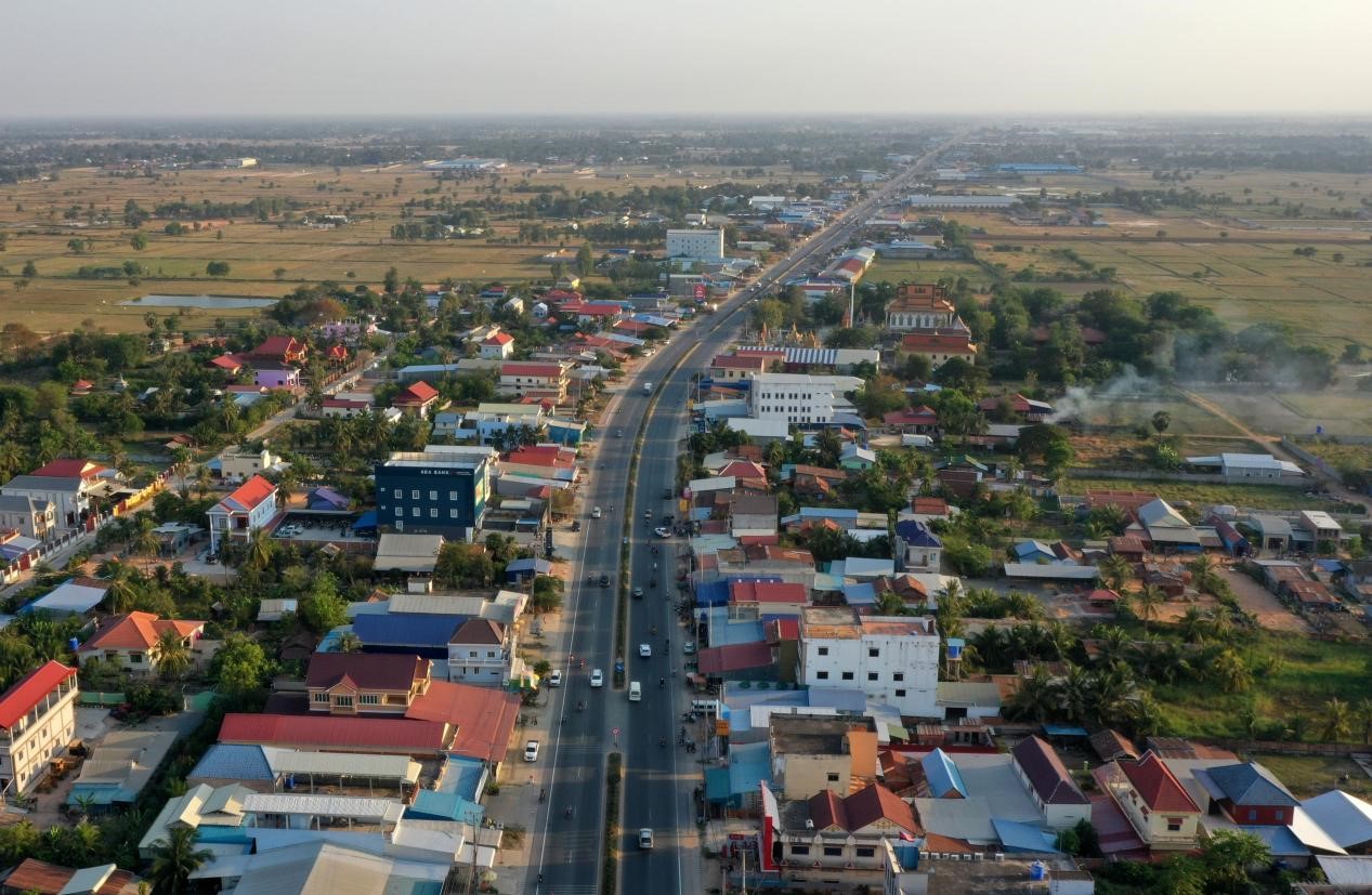 Photo taken on March 1, 2022 shows an aerial view of the China-funded National Road No. 3 reconstruction and expansion project in Takeo province, southern Cambodia. (Photo/Li Lai)