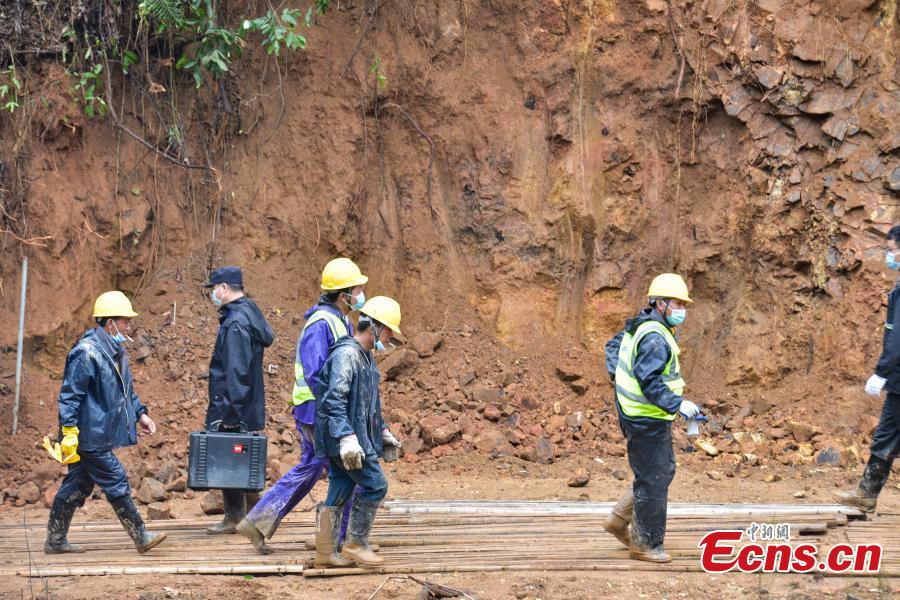 Rescue workers lay weaved bamboo on a road leading to the plane crash site in Tengxian County, south China's Guangxi Zhuang Autonomous Region, March 24, 2022. A black box of the China Eastern Airlines passenger plane that crashed Monday in south China's Guangxi Zhuang Autonomous Region was recovered on Wednesday afternoon.(Photo: China News Service/Wang Yizhao)