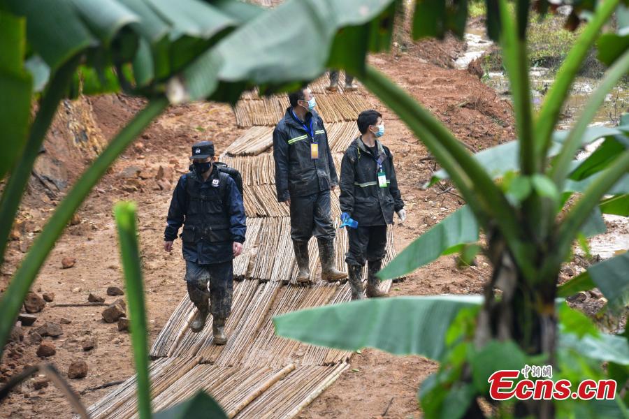 Rescue workers lay weaved bamboo on a road leading to the plane crash site in Tengxian County, south China's Guangxi Zhuang Autonomous Region, March 24, 2022. A black box of the China Eastern Airlines passenger plane that crashed Monday in south China's Guangxi Zhuang Autonomous Region was recovered on Wednesday afternoon. (Photo: China News Service/Wang Yizhao)