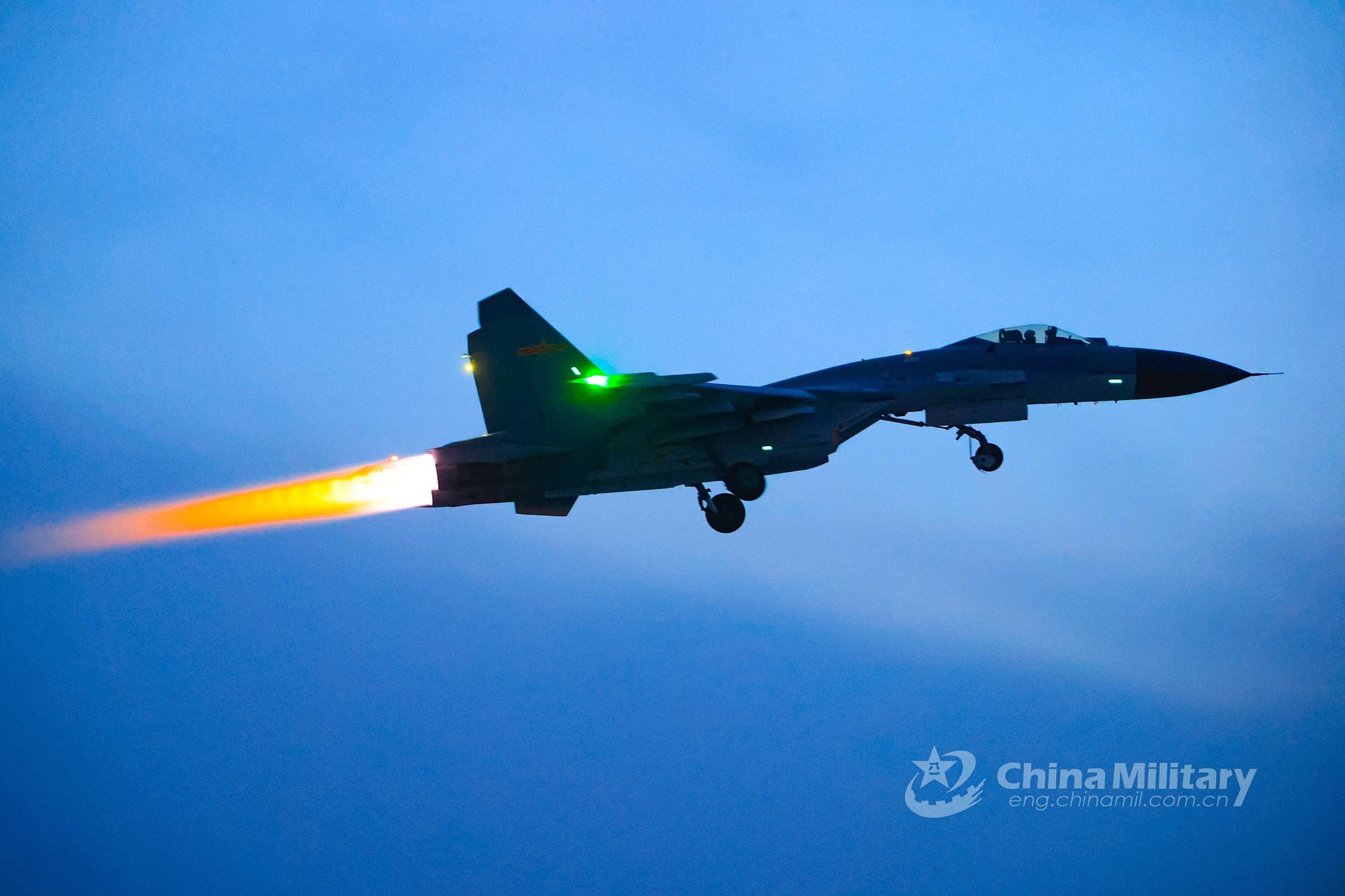 A fighter jet attached to an aviation brigade under the PLA Air Force soars into the sky in a flight training exercise on March 8, 2022. (eng.chinamil.com.cn/Photo by Cui Baoliang)
