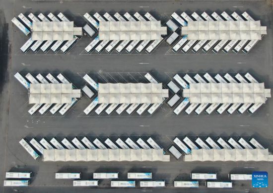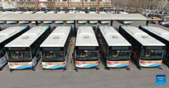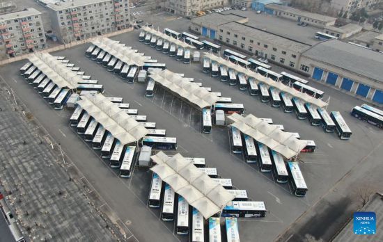 Aerial photo taken on March 24, 2022 shows a bus terminal in Shenyang, capital of northeast China's Liaoning Province. The city transit system of Shenyang is out of service from March 24-30, in a bid to contain the local resurgence of COVID-19. (Xinhua/Yang Qing)