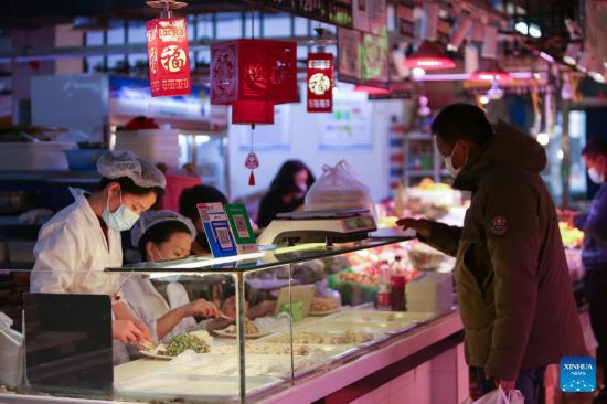 A resident buys dumplings at a market in Shenyang, capital of northeast China's Liaoning Province, March 25, 2022. The city transit system of Shenyang is out of service from March 24-30, in a bid to contain the local resurgence of COVID-19. (Xinhua/Wang Yijie)