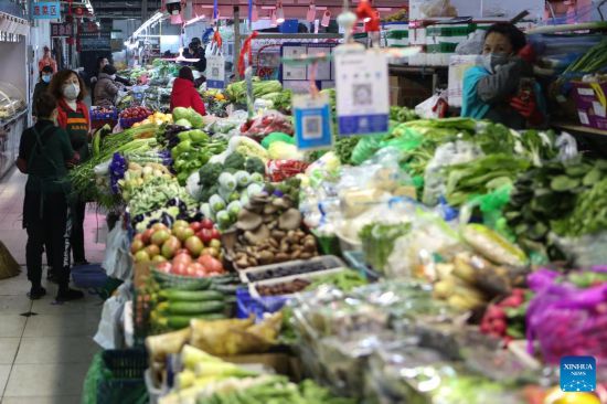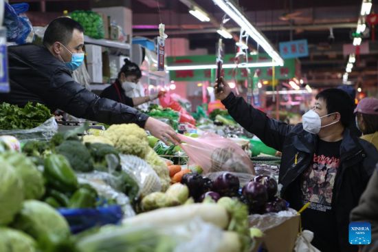 A resident scans a QR code to pay for the vegetables at a market in Shenyang, capital of northeast China's Liaoning Province, March 25, 2022. The city transit system of Shenyang is out of service from March 24-30, in a bid to contain the local resurgence of COVID-19. (Xinhua/Wang Yijie)