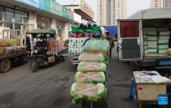 Venders transfer vegetables at a wholesale market in Shenyang, capital of northeast China's Liaoning Province, March 23, 2022. The city transit system of Shenyang is out of service from March 24-30, in a bid to contain the local resurgence of COVID-19. (Xinhua/Zhai Xiaoshan)