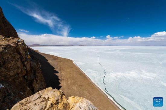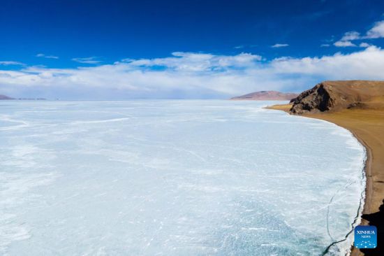 Aerial photo taken on March 24, 2022 shows a view of the frozen Serling Tso Lake in Nagqu, southwest China's Tibet Autonomous Region. (Xinhua/Kelsang Namgyai)
