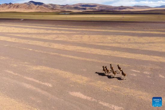 Aerial photo shows Tibetan wild donkeys in Nagqu of southwest China's Tibet Autonomous Region, March 24, 2022. Tibet Autonomous Region in southwest China has become an ideal habitat for wild animals over the years amid the region's thriving biodiversity protection endeavors.
