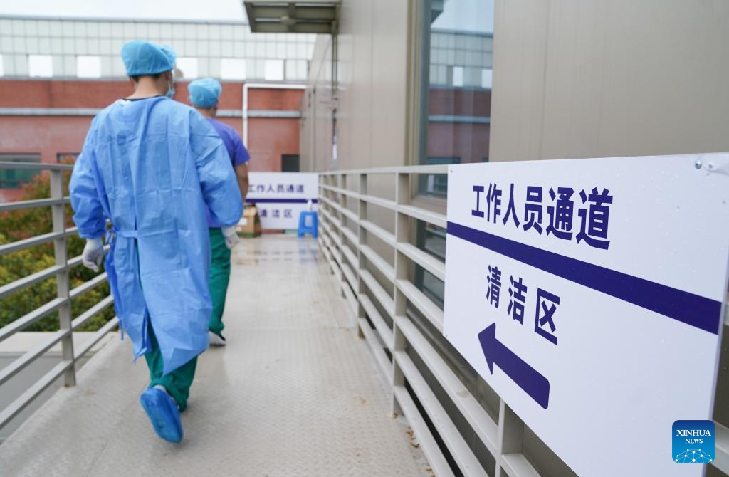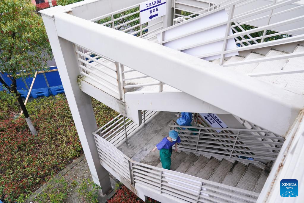 Medical workers work at a centralized quarantine area of the north hospital of Ruijin Hospital in east China's Shanghai, March 25, 2022. The hospital has been renovated and put into operation recently. More than 1,700 mild and asymptomatic COVID-19 patients have received treatment here. At present, a number of medical institutions in Shanghai have been converted into centralized quarantine centers for mild and asymptomatic patients. (Xinhua/Ding Ting)