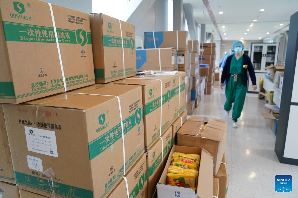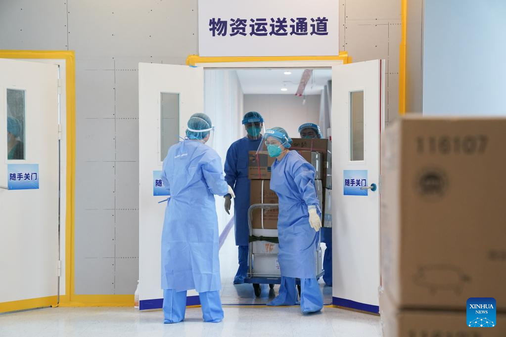 Medical workers deliver supplies to a centralized quarantine area of the north hospital of Ruijin Hospital in east China's Shanghai, March 25, 2022. The hospital has been renovated and put into operation recently. More than 1,700 mild and asymptomatic COVID-19 patients have received treatment here. At present, a number of medical institutions in Shanghai have been converted into centralized quarantine centers for mild and asymptomatic patients. (Xinhua/Ding Ting)