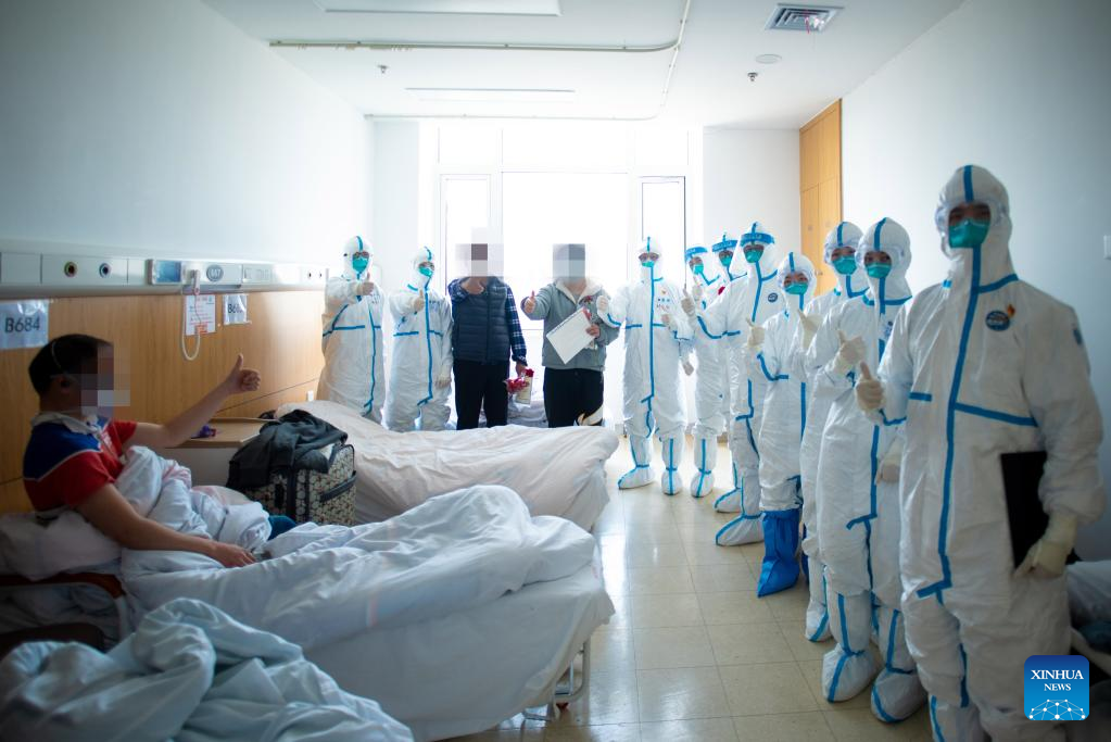 Medical workers and patients are seen at a centralized quarantine area of the north hospital of Ruijin Hospital in east China's Shanghai, March 24, 2022. The hospital has been renovated and put into operation recently. More than 1,700 mild and asymptomatic COVID-19 patients have received treatment here. At present, a number of medical institutions in Shanghai have been converted into centralized quarantine centers for mild and asymptomatic patients. (Xinhua)
