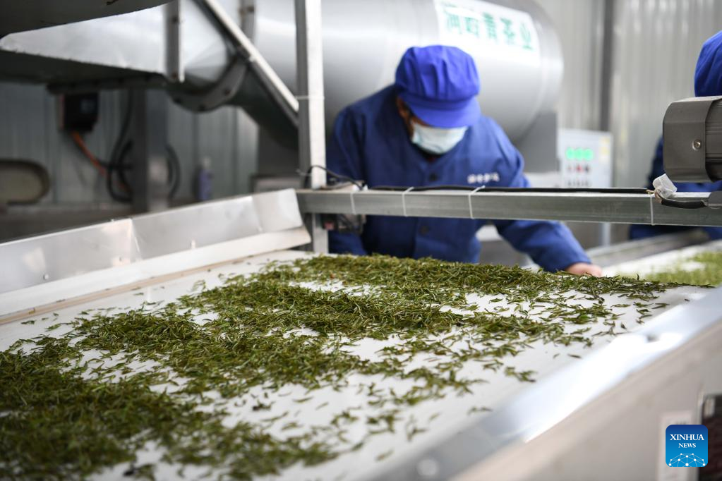 A worker processes tea leaves at a workshop in Wugongling Village of Shexian County, east China's Anhui Province, March 24, 2022.