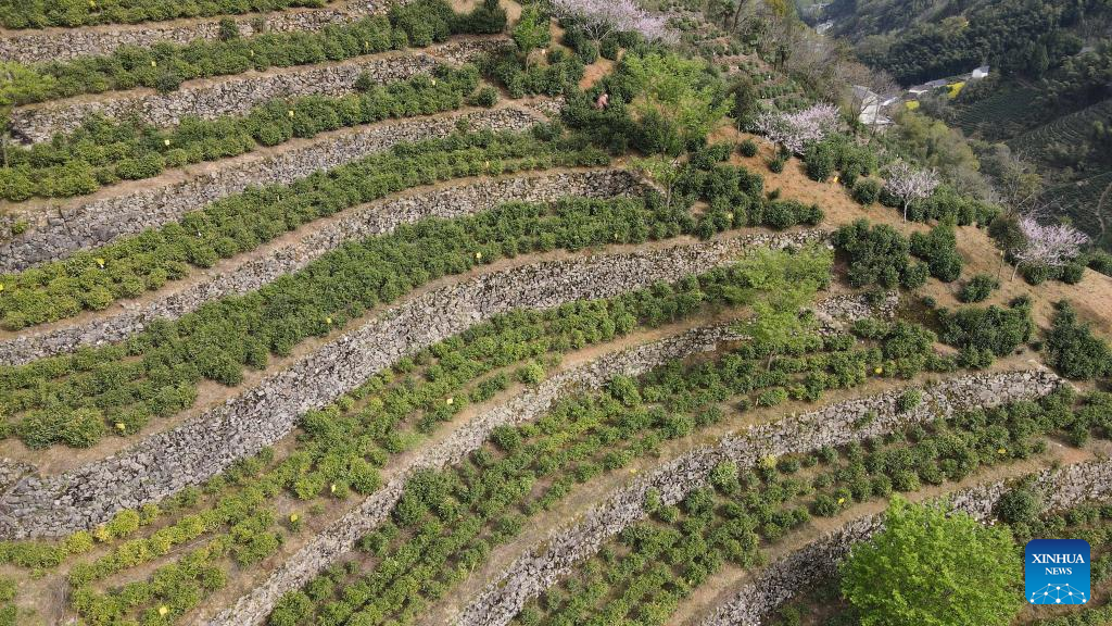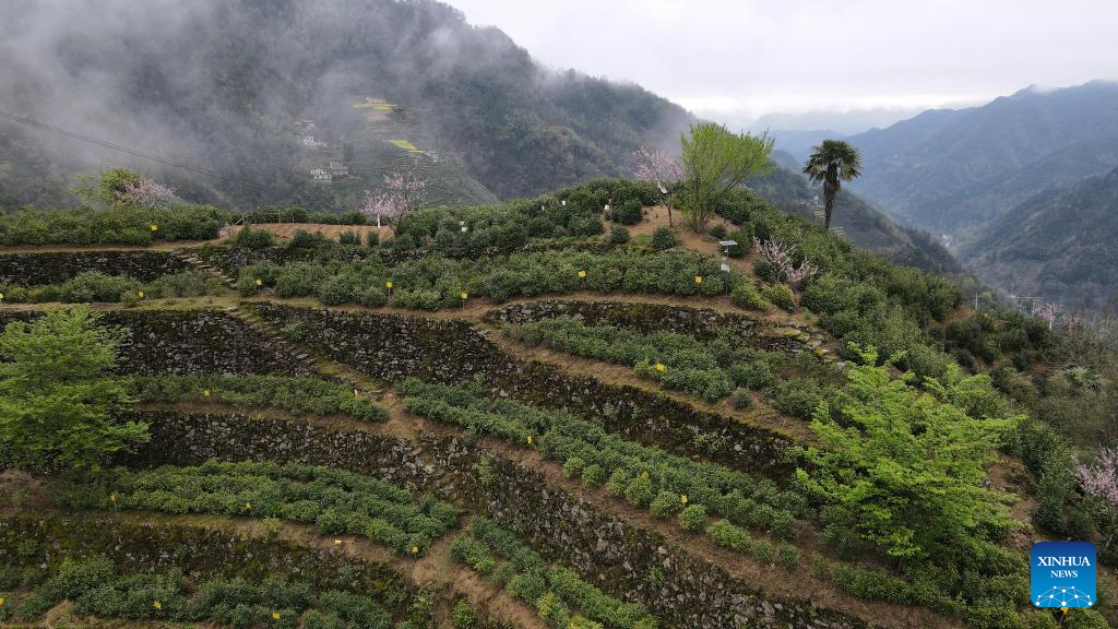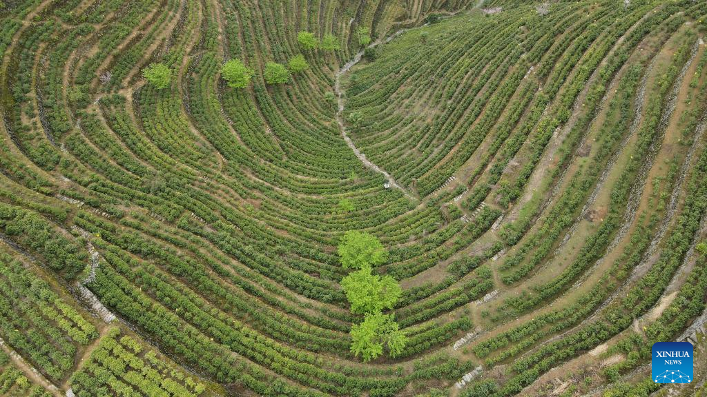 Aerial photo taken on March 24, 2022 shows a view of a terraced tea garden in Wugongling Village of Shexian County, east China's Anhui Province.