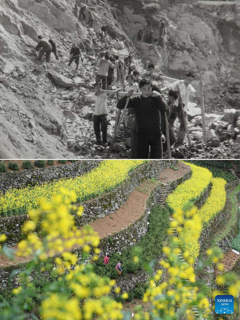 TOP: Villagers build a tea garden with stones on a barren mountain in 1973 (file photo) in Wugongling Village of Shexian County, east China's Anhui Province;
